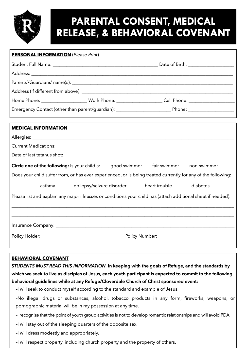 This Medical Release and Behavioral Contract needs to be on file before a student can travel for any official Refuge trip. This ensures that we have important emergency information about your child and also establishes behavioral expectations.